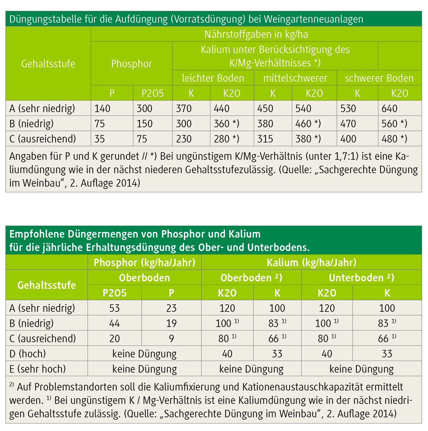 Eine mangelnde Nährstoffversorgung (besonders von Kalium) führt nicht nur zu einer starken Beeinträchtigung der Trauben- und Weinqualität, sondern auch zu einer Verminderung der Widerstandsfähigkeit gegen Frost. Außerdem können durch die Schwächung bestimmte Pilzkrankheiten verstärkt auftreten. Im Unterschied zur Stickstoffdüngung ist die Phosphor- und Kaliumzufuhr nicht zeitgebunden. Diese Nährstoffe werden aber am besten im Herbst ausgebracht. Liegt von einem Weingarten eine Bodenuntersuchung vom Oberboden (OB) und Unterboden (UB) von den Nährstoffen Kalium und Phosphor vor, dann ist die Düngeempfehlung für die beiden Horizonte zusammenzuzählen. Die Ausbringung hat in den jeweiligen Horizont zu erfolgen. Liegt keine Bodenuntersuchung vor, wird Stufe C1 angenommen.