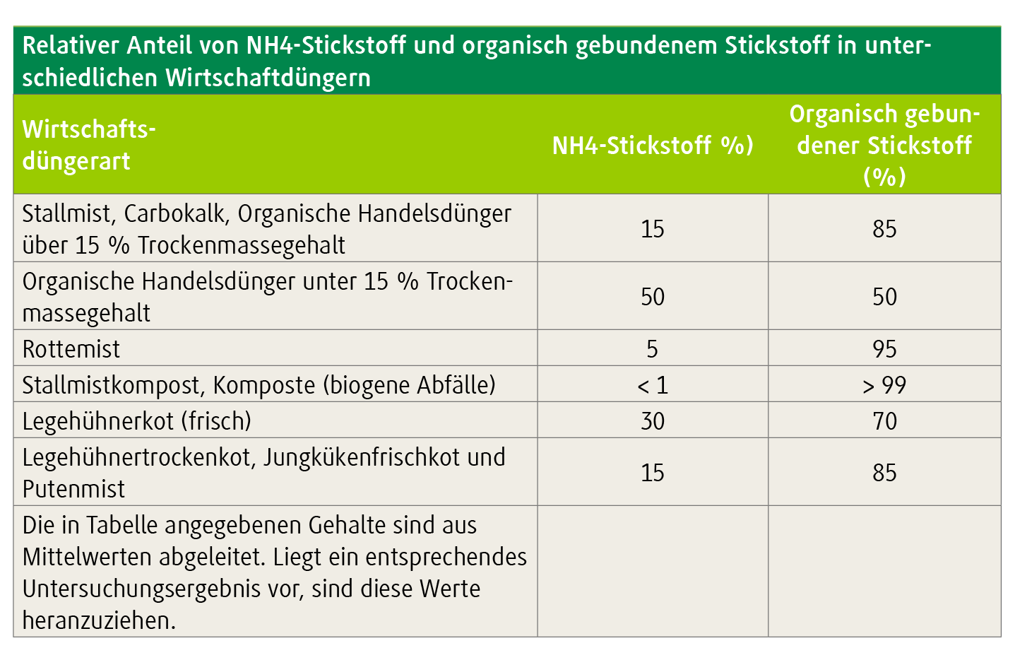 Ein Überblick über die relativen Anteile von Ammoniumstickstoff (mineralischem Stickstoff) und organisch gebundenem Stickstoff in Wirtschaftsdüngern ist in der Tabelle zu finden. Je höher der Anteil an mineralischem Stickstoff ist, umso höher ist auch die unmittelbare Wirksamkeit.
