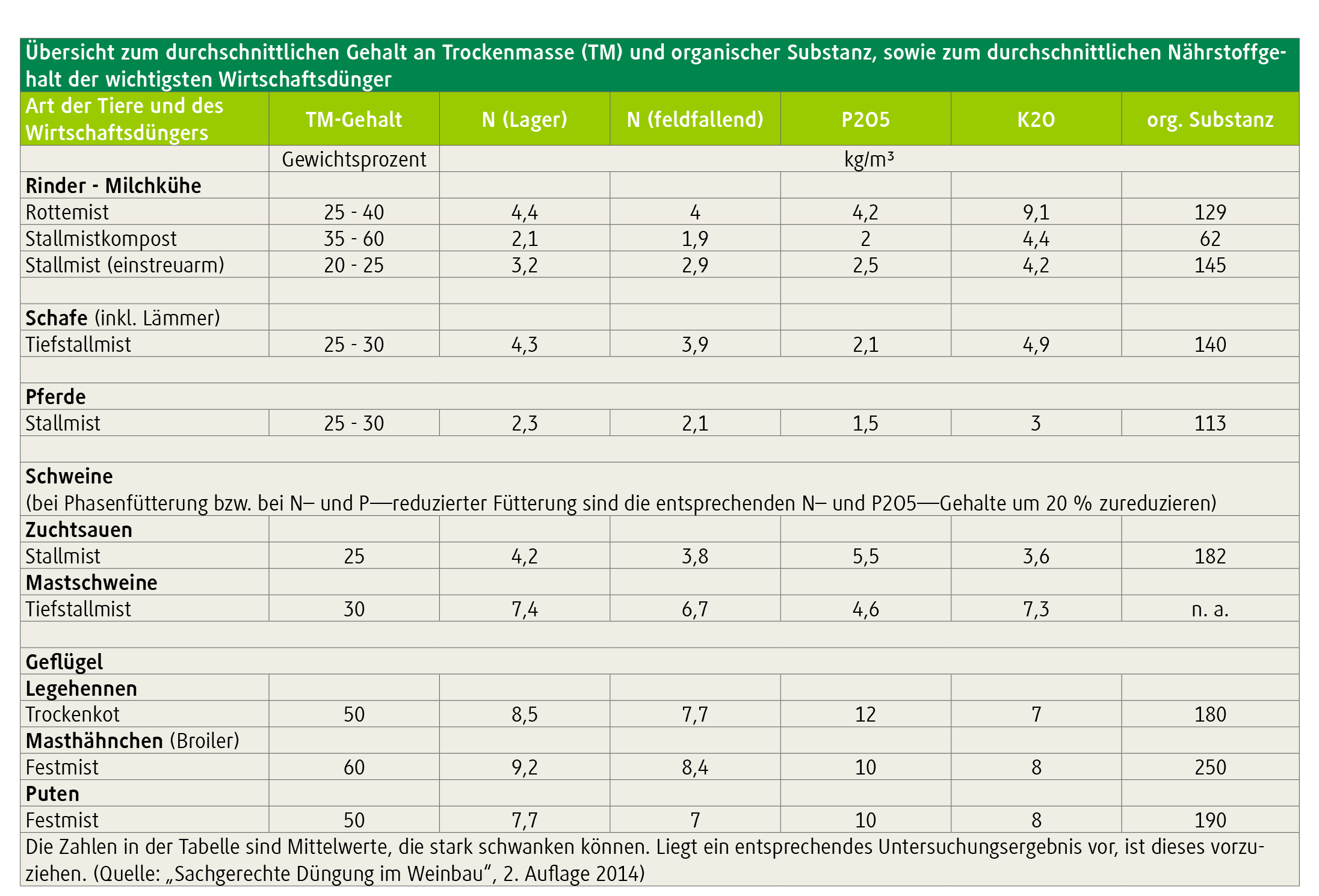 • Gehalt an Trockenmasse (TM) und organischer Substanz PNG 155,03 kBÜbersicht zum durchschnittlichen Gehalt an Trockenmasse (TM) und organischer Substanz, sowie zum durchschnittlichen Nährstoffgehalt der wichtigsten Wirtschaftsdünger